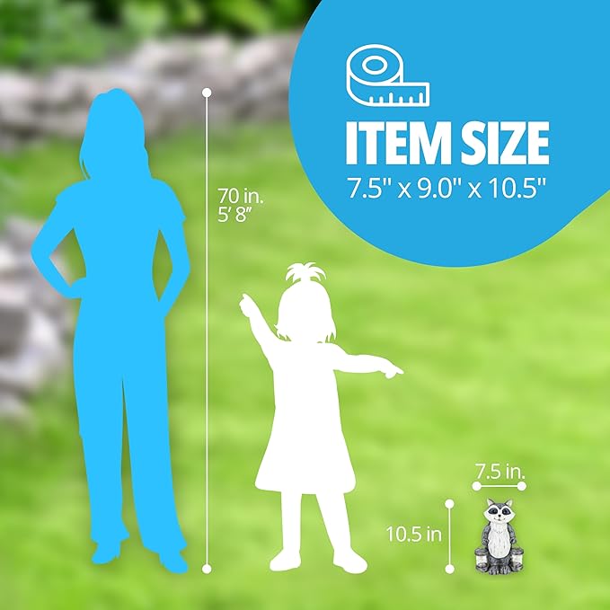 • RACCOON GARDEN STATUARY: Add a touch of adorable charm and enchantment to your garden decor with the Exhart Raccoon Solar Garden Statue; crafted from durable resin and meticulously hand painted, these solar garden decorations are an excellent way to add cute and whimsical decor and soothing accent lighting to your outside garden, front porch, patio, lawn, or yard