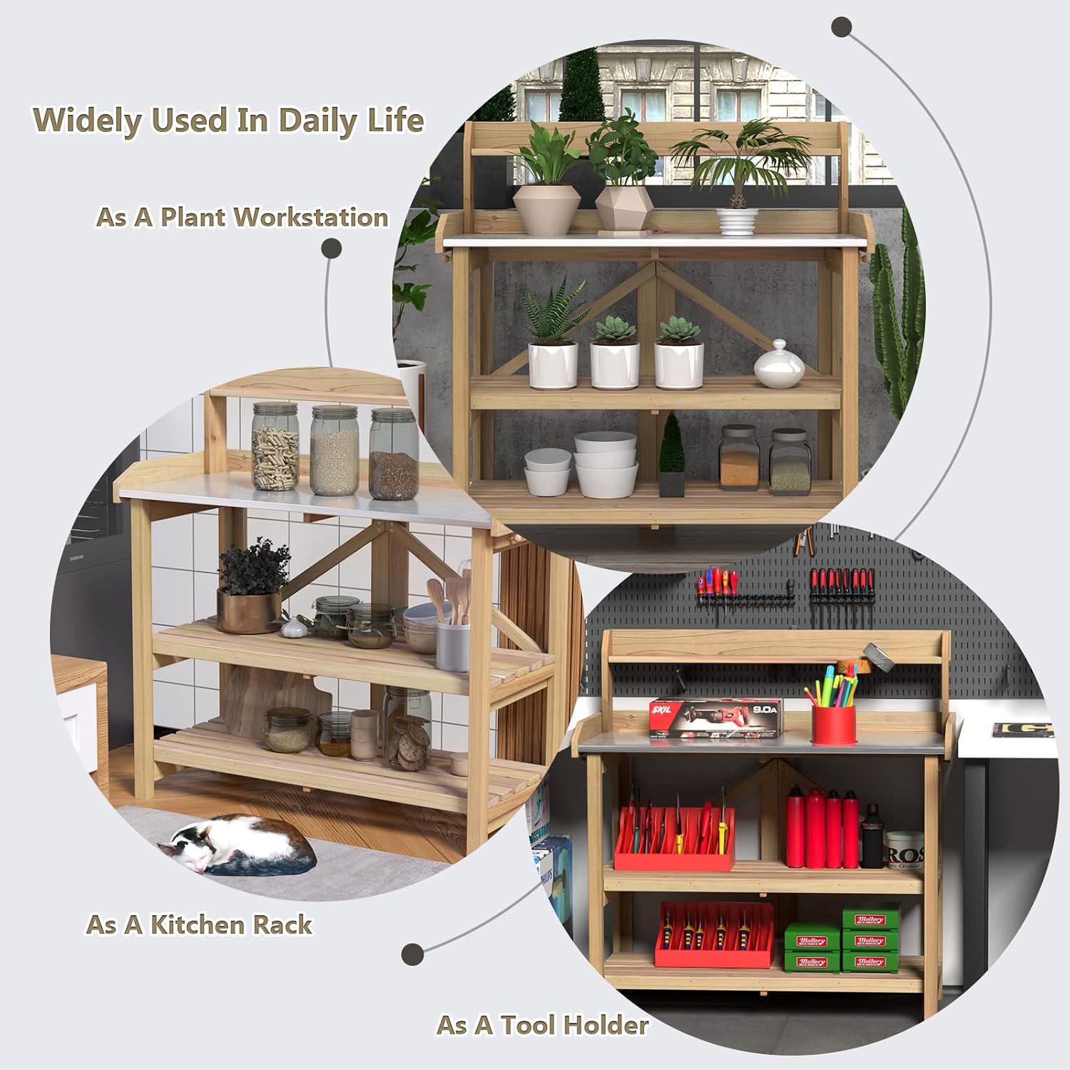 • 【Spacious Workspace】The vertical 3-layer open shelf design realizes the maximum effective use of space, providing a spacious area to place your gardening tools, accessories, potted plants, etc. And the sturdy galvanized metal table top is suitable for various gardening operations without being corroded or damaged.