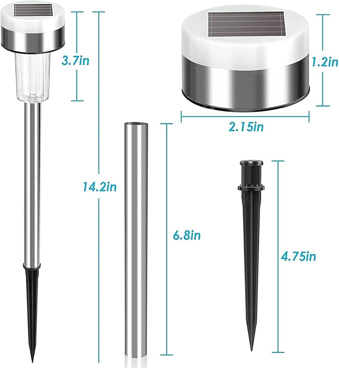 • HIGH EFFICIENCY:This solar path light measures 2.6Ă—2.6Ă—13.07 inches and charge during the day, turn on at night and turn off at dawn automatically. After fully charged, this solar light can last 12 hours.