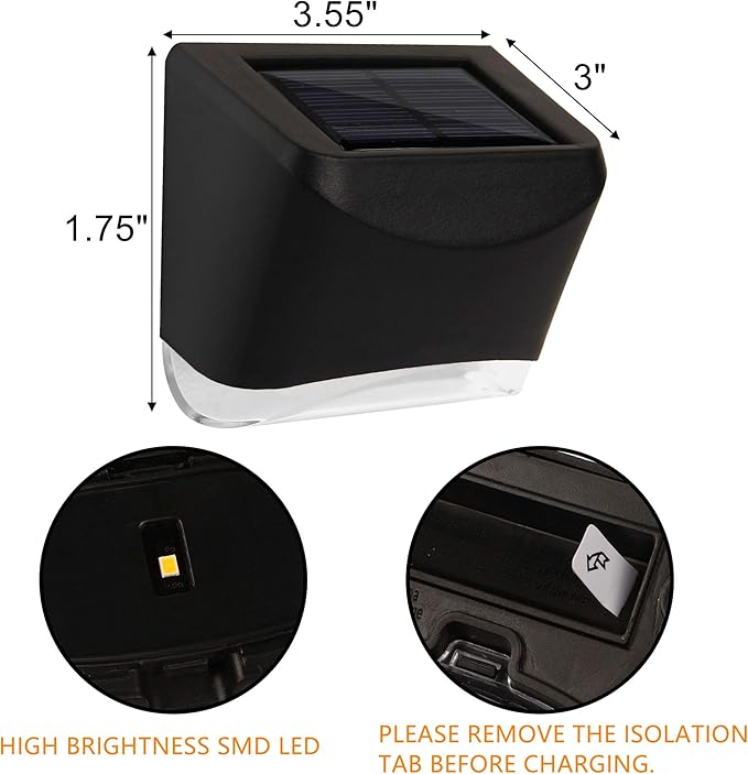 • Outdoor Solar Decoration: The solar deck lights illuminates and make your home feel safer and more welcoming. These are ideal for patio, yard and garden, backyard, stair, fence post. There is an INSULATION STRIP on the back of the light, please remove insulation strip before charging.