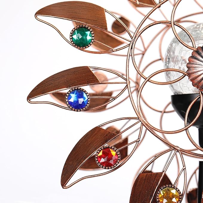• KINETIC DESIGN: The crackle glass ball sits between two tiers of gracefully spinning wind blades, offering a stunning display of jewel tone colors for up to 8 hours.During the day, enjoy the kinetic movement of the wind spinner while the solar panel converts sunlight to electricity. At night, the spinner?s LED light provides an ambient color changing light display