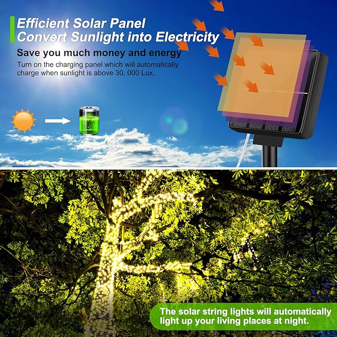 • 【Eight Romantic Lighting Modes】These solar string lights feature eight lighting modes, including steady on, combination, in waves, sequential, slow-glow, chasing, slow fade and twinkle. Different lighting settings produce different lighting atmosphere. So you could choose your preferred lighting mode to decorate your home in special festivals or brighten up the exterior of your home at night