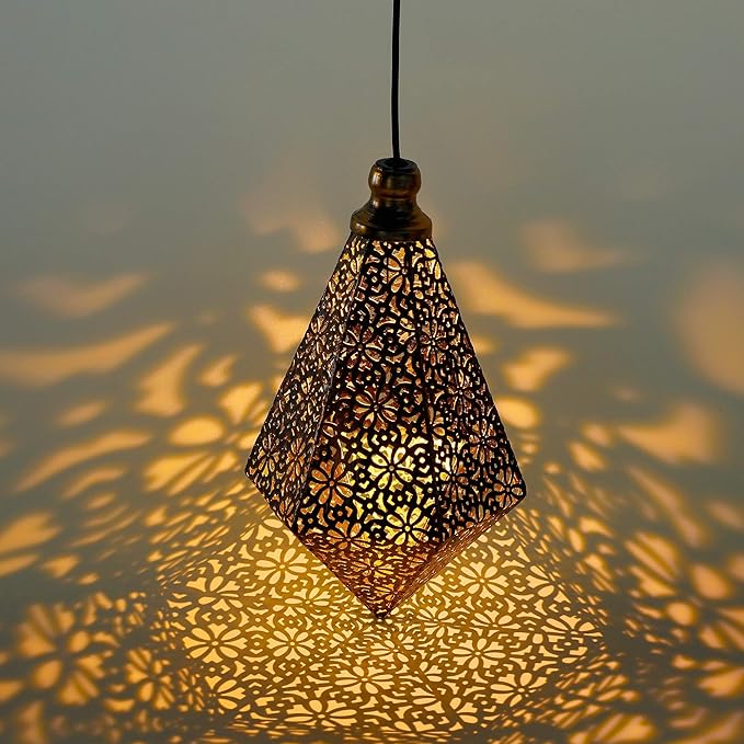 • 2 Pack Unique Diamond Shape Hanging Lantern: MAGGIFT outdoor solar lanterns equipped with sensitive light sensor as well as high quality and durable iron (antique bronze finish) and ABS material, neither get faded or deformed easily. The warm white light after full sun is much more soft and gentle. It shines a wonderful light on the floor and enriches the atmosphere of joy in your house, filling the surroundings with peace and beauty.