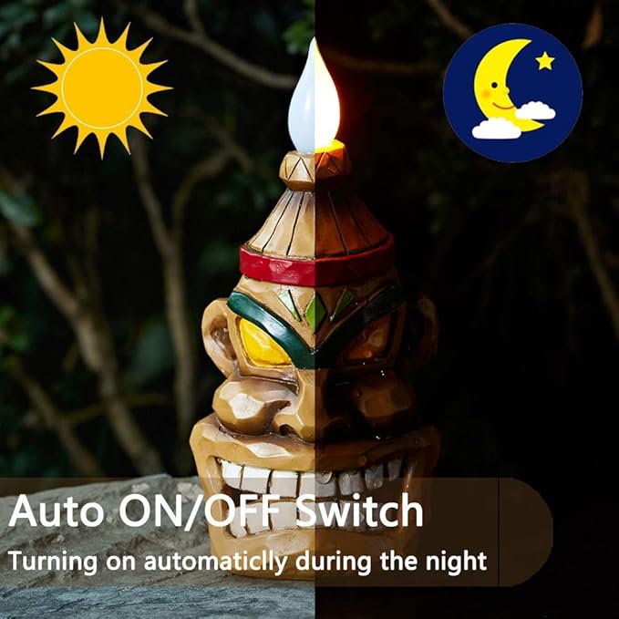 • 【AUTO-ON SOLAR DECORATION】This solar tiki statue is very easy to install and use. Simply turn on the switch and place it under the sunlight and let the solar panel will charge within 5-8 hours during the day and light up automatically at night for 6-8 hours