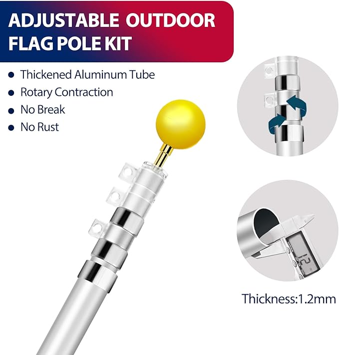 • PREMIUM MATERIAL- Our telescopic flag pole is made of premium aluminum material to offer an excellent performance in anti-rust and anti-corrosion, the flag pole for outside in ground is designed to meet any bad outdoor environments like snowy and heavy rainy, built to last.