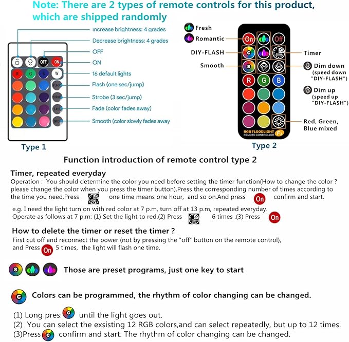 • 12V Low Voltage Landscape Lights:(Light Color is Mixed, NOT Pure RGB) DC/AC 12V Low Voltage Landscape Lighting safe to human body;Input 110V, output 12V; This is a remote controlled and color changing 10W RGB Outdoor Spotlight; In addition to easy operation and brightness adjustment, it also has Smooth mode, relaxation modes, romantic modes, 12 color choice, 24-hour timer function, memory function, 3 dynamic modes, which is very suitable for multiple purposes in life.