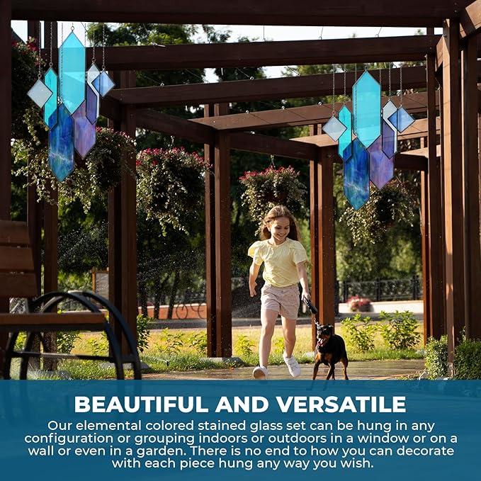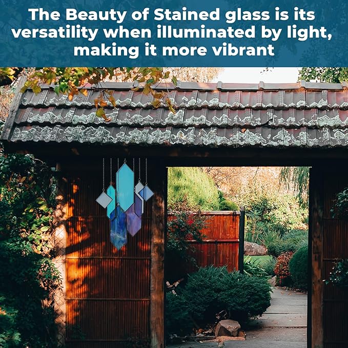 • 💯 Genuine Stained Glass Suncatcher: Crafted from real stained glass in a captivating Azure Blue design, this translucent window hanging is ideal for brightening up any space. Great for window decor, suncatchers, and glass art pieces for your home.