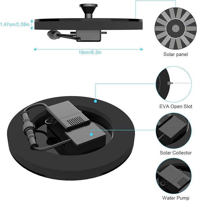 • ✔ 【Suggestion】: Make sure there is enough water in the pool/birdbath, and make sure the place where you place the fountain has enough sunlight, the fountain will only work properly if it is exposed to full sunlight. Note: It does not store any energy! Without sunlight it will stop working!