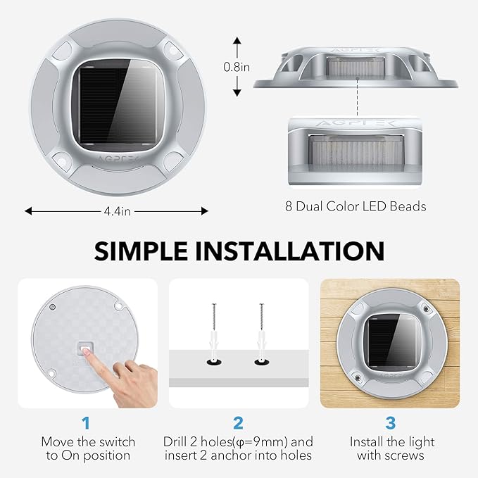 • 【IP68 WATERPROOF & SUPER STURDY】With an IP68 waterproof design and a tightly sealed battery compartment, these solar lights can resist any terrible weather, like a rainstorm, or daily heat. High-quality aluminum alloy shell effectively keeps these outdoor solar LED deck Lights from rusting and can withstand up to 3 tons of weight, no need to worry about automobile and kids stepping on.