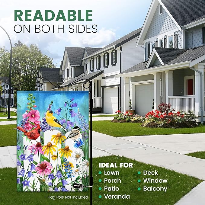 • SUITS STANDARD STANDS (NOT INCLUDED) - Double-sided, you can display it on the home lawn, porch, patio, deck, veranda, window, or on a wall. Our spring outdoor flags are easy to install and fits most stands.