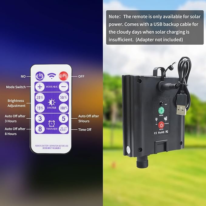 • 【8 SETTING MODES WITH DIMMABLE REMOTE】 8 lighting modes to change:combination, in wave, sequential, slo-glo, chasing/flash, slow fade, twinkle/flash, and steady-on.You can transfer the modes by the button on the back of the solar panel or by the remote. The settings can be set easily by pressing the buttons on the remote: timing or lights moede changing.PLS NOTE: The remote only work for the solar modes NOT for the plug