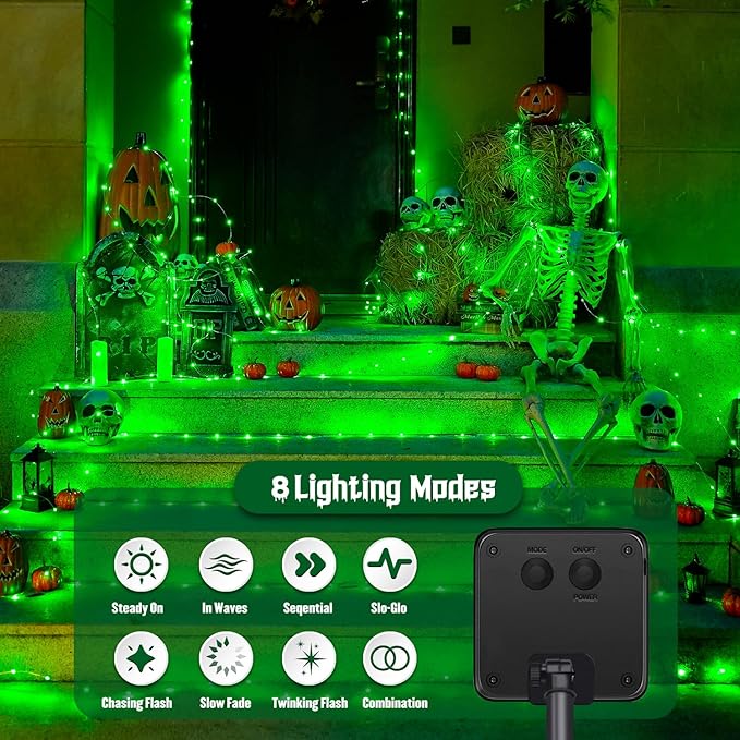 • Green Halloween Lights Outdoor Waterproof: Both the copper wire and the solar panel are IP44 Waterproof, it withstands all kinds of weather, including heavy rain and snow. Solar Christmas lights are suitable for both indoor and outdoor usage without any worry of short circuits or weather damage
