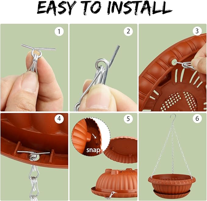 • Easy to install: Two kinds of chains are shipped randomly. Passing the metal chain through the holes on the edge of the planters to install the chain. Snapping the protrusion of the tray into the groove at the bottom of the pots to install the tray. Refer to detailed pictures and videos.