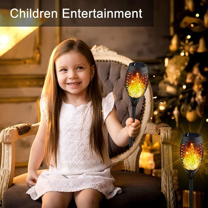 • Flame Torches Flickering Flames: Solar outdoor lights outdoor decorative flicker a soft and mod-enhancing "Real" flame for outside decorations for patio, yard, porch, pool,garden decor and for party, camping, barbecue, wedding, christmas, halloween decor.