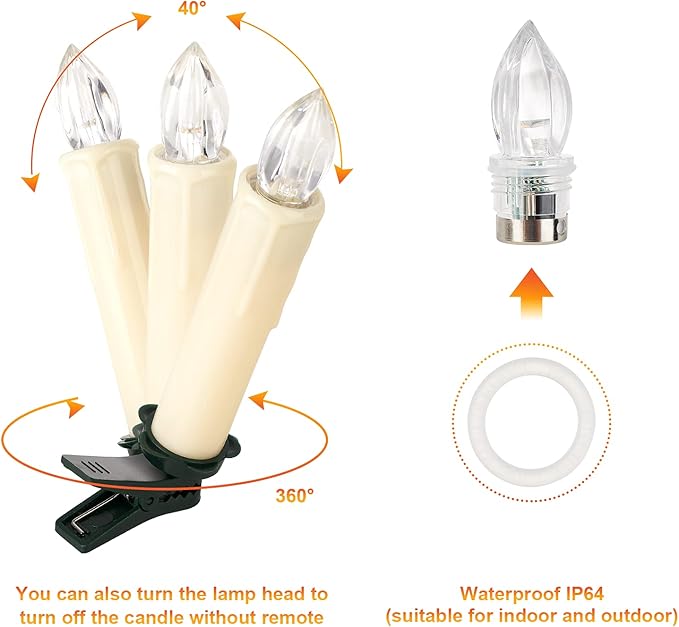 • PACKAGE:30*LED window candles(Batteries not included) , 30*clips,30*waterproof rings, 1*remote control, 1*user manual.Each led taper candle has thoroughly tested, if the flameless tapers has any problem.Please feel free to contact our customer service, we will try our best to help you.