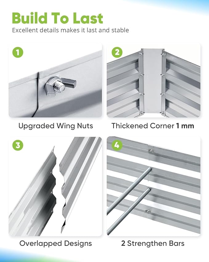 • 【Built To Last】Garden raised planting bed is made of powdered coating galvanized steel panel, assure fine condition of the metal garden bed, it's able to stand harsh weather conditions, won't crack in years, use without worry.