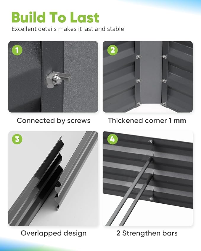 • 【Built To Last】Garden raised planting bed is made of powdered coating galvanized steel panel, assure fine condition of the metal garden bed, it's able to stand harsh weather conditions, won't crack in years, use without worry.