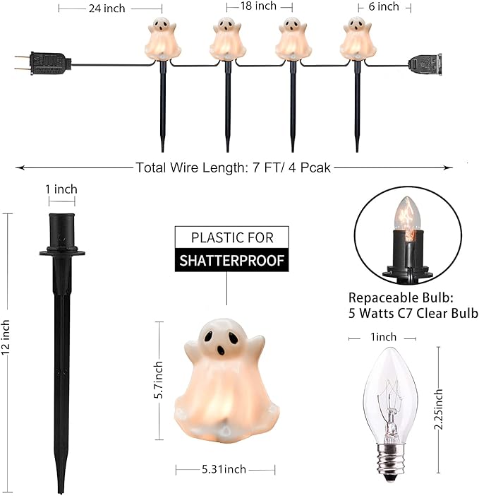 • ☛Halloween Ghost Pathway Lights: 7 Ft Halloween pathway marker lights with 4 white ghost lights, 4 plastic stakes, 24 inch lead with male plug, 12 inch spacing between white ghosts lights, 6 inch tail with female connector