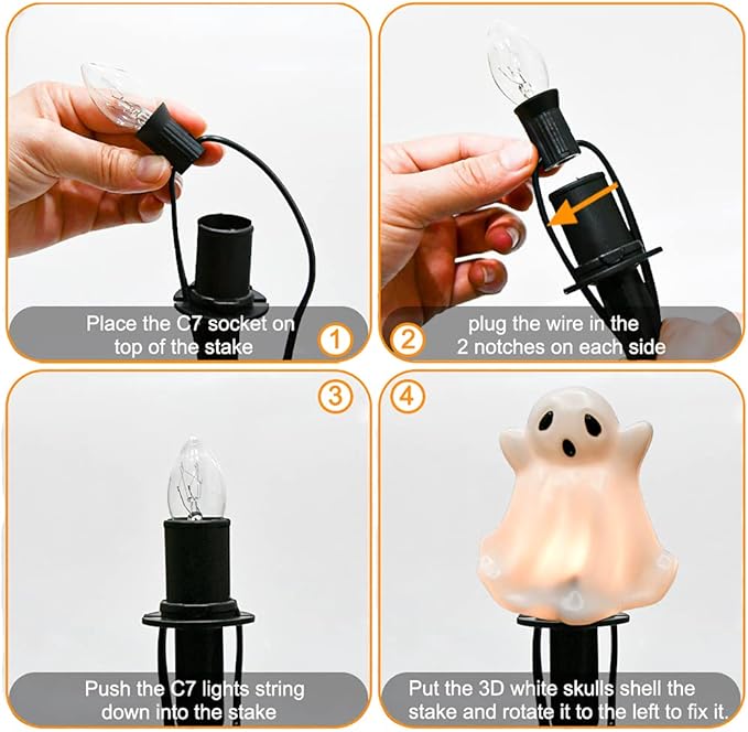 • ☛Safe and Energy Saving: Halloween Walkway ghost stakes lights with 4 C7 clear bulbs E12/C7 candelabra socket base, 5W per bulb, UL Listed for indoor and outdoor use. If a light bulb that goes out does not affect other lighting bulb, a spare fuse stored in lead plug.