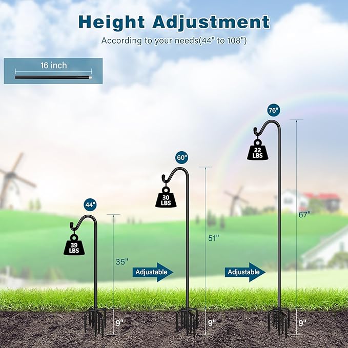 • 【HIGH QUALITY & ADJUSTABLE】 The height of the shepards hooks for outdoor is 76 inch and the diameter is 5/8 inch. Our garden hook is made of high quality iron, the black coating on the surface is rust resistant. The height of the shepherds hook for bird feeder can be adjusted by adding or reducing the pole sections, each pole section is 16 inch. So you can adjust the height to 60 inch and 44 inch.
