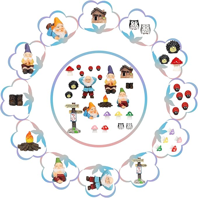 • Different size of gnome statues: you will receive a full set of gnome fairy resin statues, including 1 piece reclining gnome (2 x 1.6 x 0.6 inches), 1 piece crawling gnome (2.2 x 1 x 1.1 inches), 1 piece sitting gnome with its shoes off (2 x 1 x 1.4 inches), 1 piece sitting gnome in shoes (1.9 x 0.9 x 1.8 inches), 1 pair of shoes (0.6 x 0.7 x 0.5 inches) and 1 piece fire statue (1.4 x 1.4 x 1.2 inches