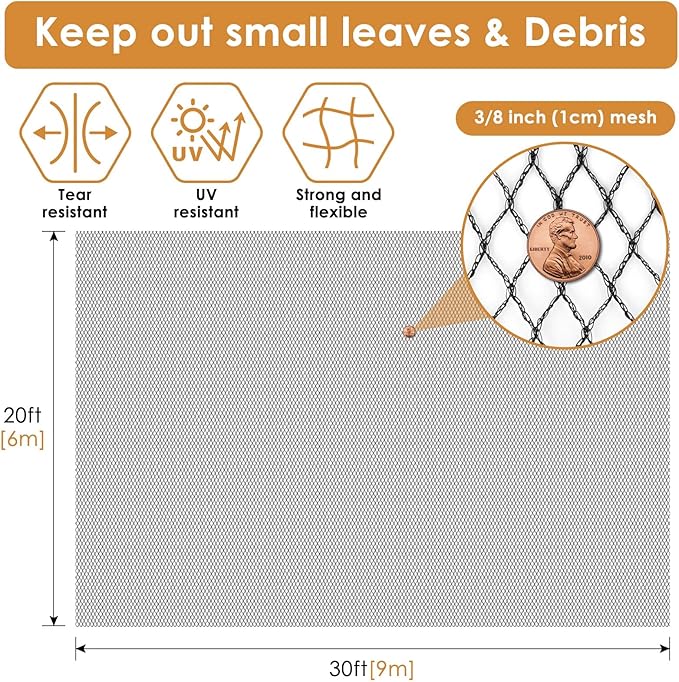 • ๐—ฅ๐—ฒ๐—น๐—ถ๐—ฎ๐—ฏ๐—น๐—ฒ ๐—™๐—ถ๐˜€๐—ต ๐—ฃ๐—ผ๐—ป๐—ฑ ๐—ฃ๐—ฟ๐—ผ๐˜๐—ฒ๐—ฐ๐˜๐—ถ๐—ผ๐—ป - 3/8 inch SMALL mesh size leaves pond netting can be effective prevents the leaves,branches and debris from falling into the ponds and keep the water be clear and healthy. Also protect your goldfish and koi fishes against birds, cats, and other predators.