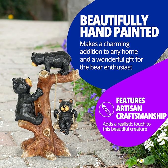 • BEAR FAMILY GARDEN STATUARY: Add cute whimsical decoration and rustic farmhouse style to your home garden decor with this adorable Black Bear Family Tree garden figurine; featuring meticulous artisan craftmanship and lovingly hand painted, this cute garden ornament depicts 2 bears climbing on a tree, and a third bear on a real moving swing, making for a great way to add adorable outside decoration to your garden, yard, lawn, patio, or front porch area