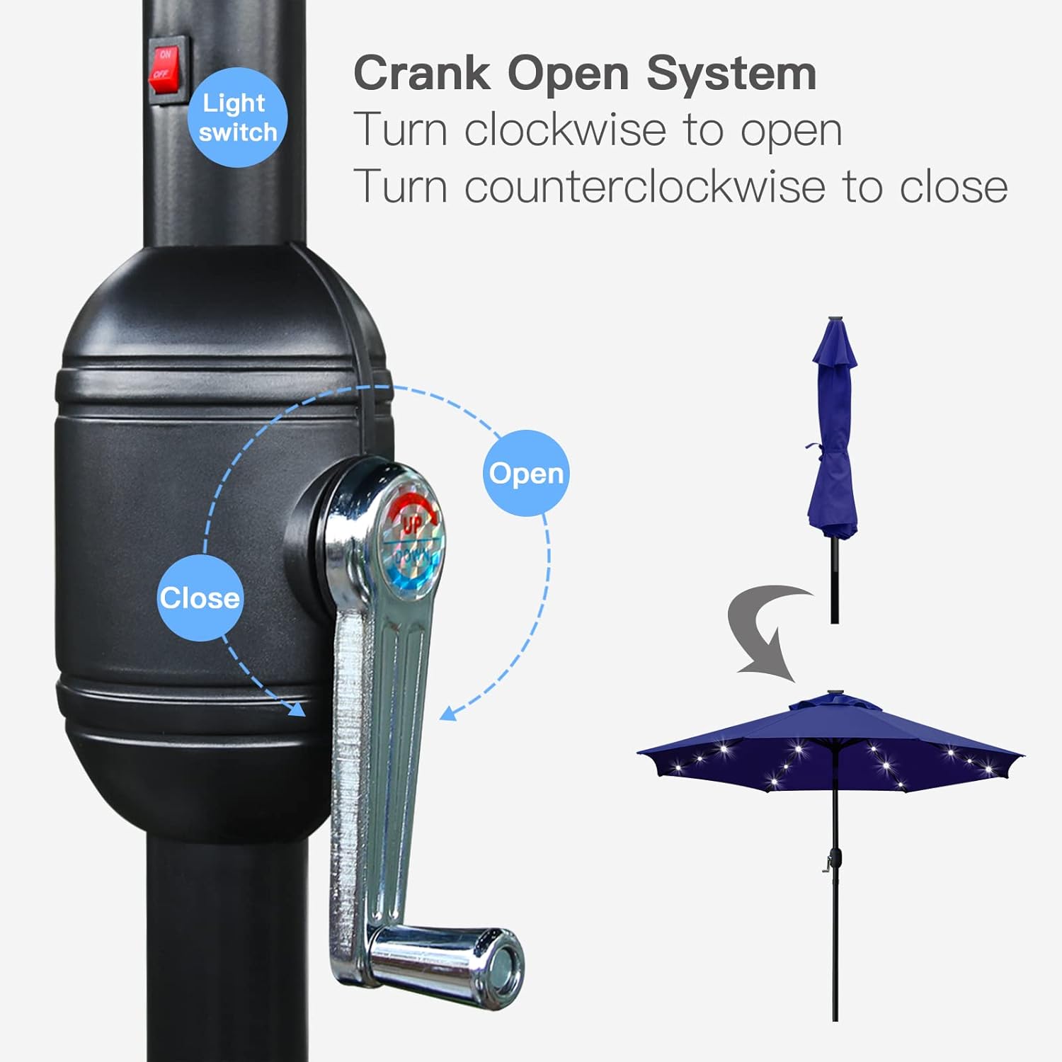 • Convenient crank opens/closes system and handy push button tilt, even easy to use for kids and the elderly. Keep the sun at the back in the daytime.