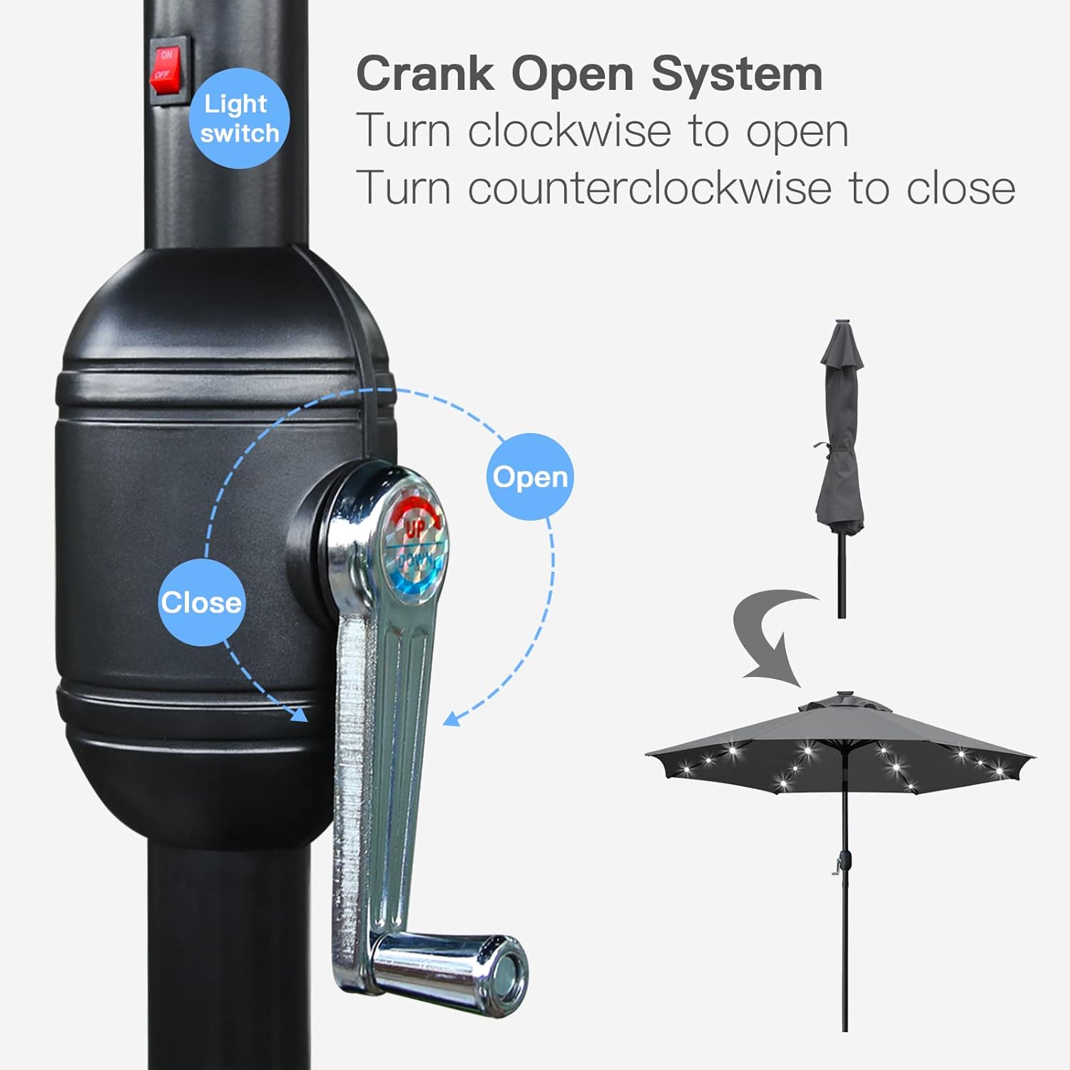 Sunnyglade 9' Solar LED Lighted Umbrella with 8 Ribs Adjustment and Crank Lift System for Patio (Grey)