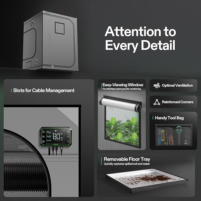 • Observation Window + Removable Floor Tray: Our easy-access observation window makes it easy to observe your plants; The detachable floor tray captures any spilled soil and keeps the tent clean