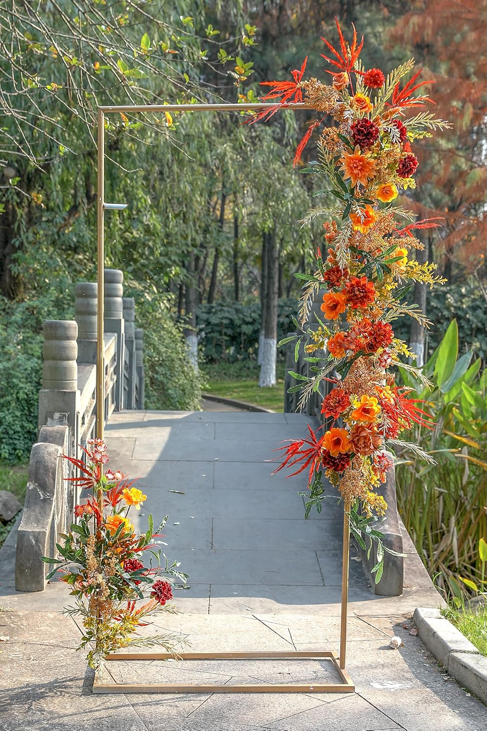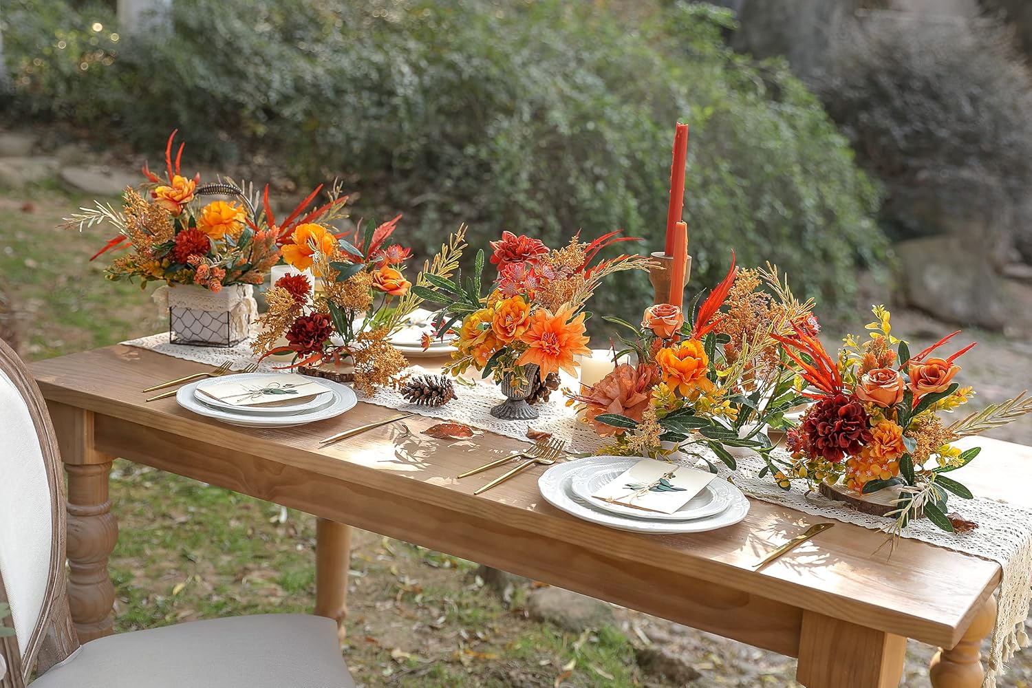 • Flower Details:Orange and red dahlia flowers x3 pcs(assorted sizes); Orange rose x7 pcs(assorted sizes);Orange Peony x2 pcs(assorted sizes);Gradient color Hydrangea x3 pcs(assorted sizes);Hydrangea branchx3 pcs;Orchid Branchesx5 pcs;Other vanilla berry branches x2pcs;Red berriesx2pcs;green leaves x43pcs;Flower wired stemsx35pcs;(About 11.8 inches)(Attached Ribbon and hot melt accessories)