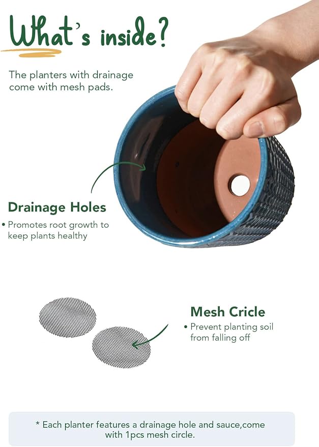 • Thoughtful Accessories: These indoor plant pots are equipped with drainage holes and saucers, ensuring proper drainage to prevent root rot. The saucer helps to catch any excess water and prevent leaks, while the mesh pad retains soil and promotes optimal ventilation. (Plant not included)