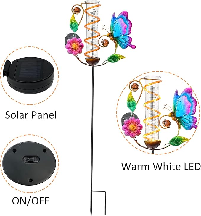 • Widely Use: The rain gauge outdoor designed with a butterfly, flower and leaves, not only can be used in measuring rainfall, but also can be used in the garden as a garden stake decoration. It measures rainfall and lights up at night to add extra visibility and style to your garden or yard.