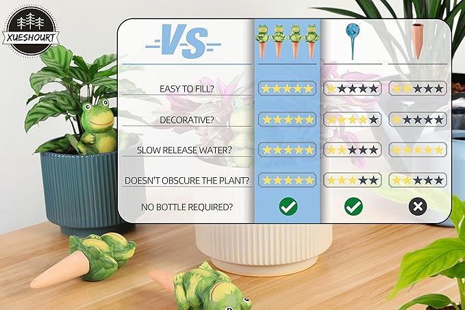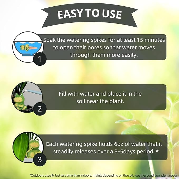 • NO COMPLEX STEP –100% Terracotta watering spikes different from watering globes or wine bottle watering spikes, easy to refill without removing. Simply pour water from your plant watering can into the head of the frog self-watering bulbs, and your plant will take care of itself. A perfect houseplant accessory.