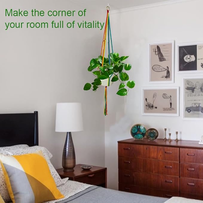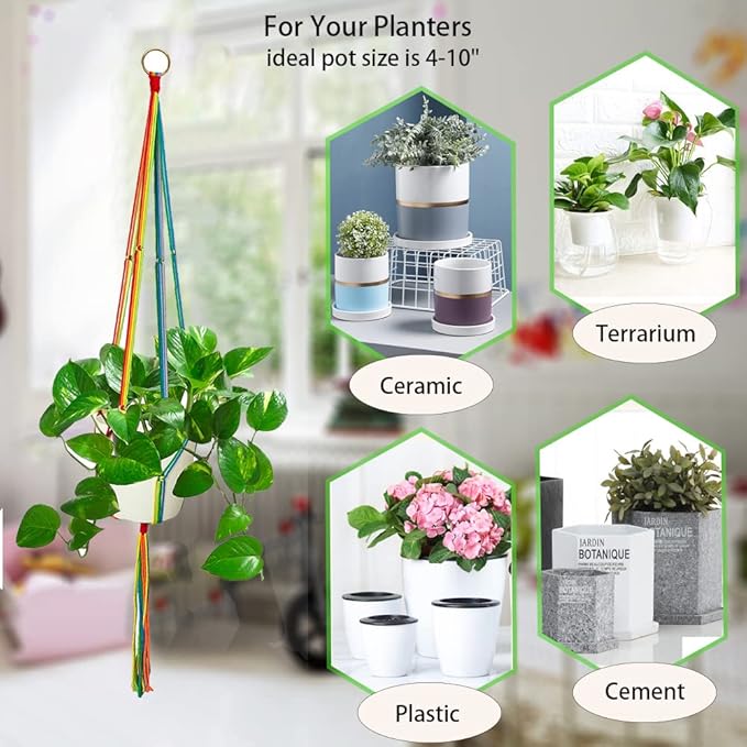 • 【SUPPER EASY INSTALLATION】 : The hangers are suitable for indoor and outdoor. Just expand the leg strings, put the plant pot in the middle of the conjunction. It is great for boho home decor, make your life become unique. Hanging plant holder can be used for windows,living room, kitchen,hall,patio,high and low ceiling.