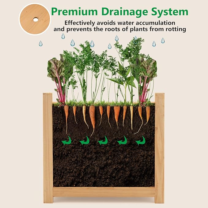 • Detachable Bottom with Drainage Hole: The bottom plank of our raised garden bed is detachable. This design makes it easy to manage and clean the planting box. There is drainage hole in the middle of the bottom plank, which is conducive to draining excess water and promoting the growth of plant roots.