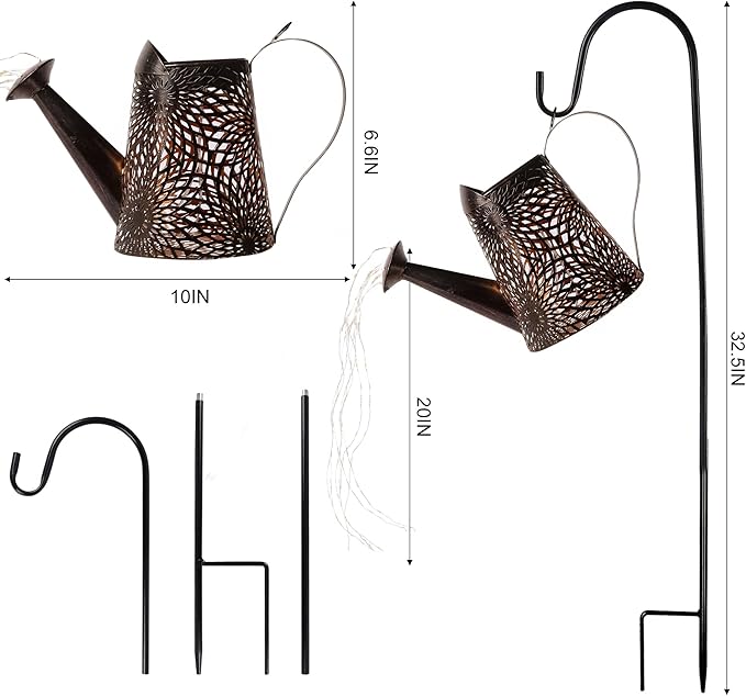 • Outdoor Solar Watering Can Garden Lights: Make a dazzling splash in your yard, porch, patio, or garden with our beautiful waterfall watering can lights garden statues with 32.5 inch shepherd hook stake. The solar outdoor watering can with 6 strands copper lights (10 LED each) adds some vitality and fun to any outdoor scene. Watering can Dimensions: 10"L x 5"W x 6.6"H.