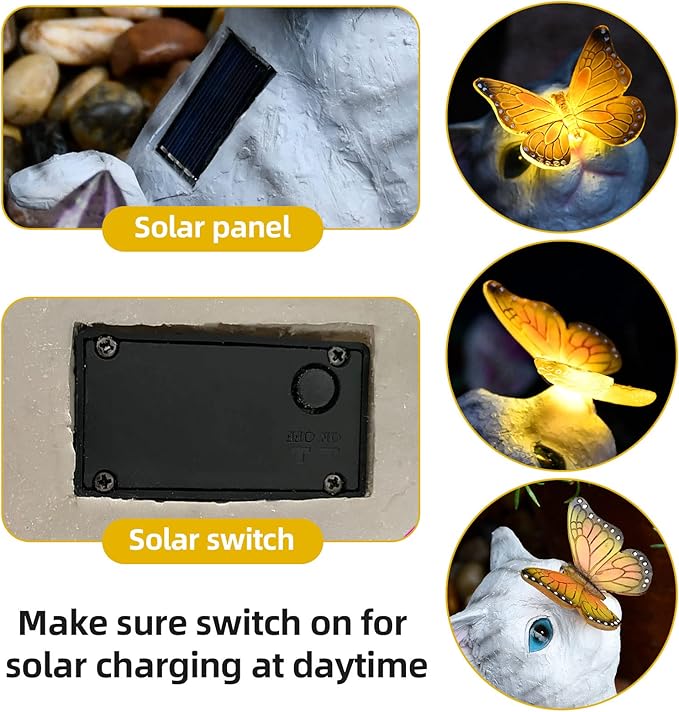 • ▶ Solar Light - Cat garden decor with solar powered, easy to use, can automatically charge the solar energy, light up at night.Energy Efficiency & smart models:with solar-powered, energy saving and energy efficiency.