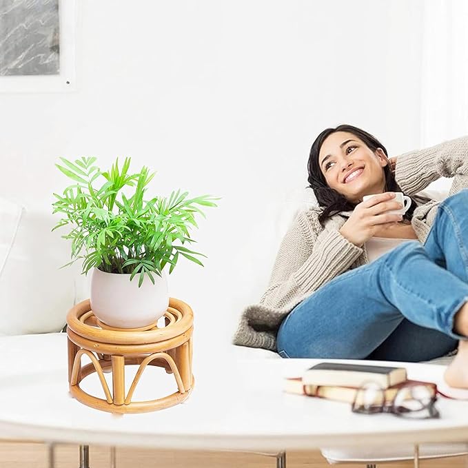 • ☘️ 【SUITABLE SIZE】: The mini size rattan stool display stand is: 6.0 × 4¼ inches, and the small size of our stand is: 8.0 × 4¾ inches. The wicker plant stand has sturdy and durable structure, its 5 thick stand points to firmly support the plant pot. Ideal for your flowerpots. Note: No flower pots !