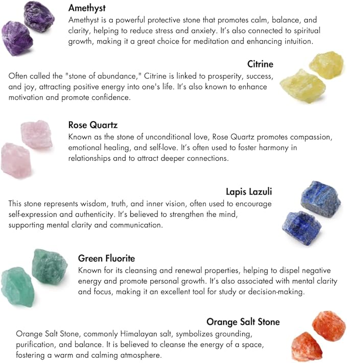 • NATURAL STONES - Natural stones can have a positive impact on your life. Their beauty can brighten up any space if you use them as decor on your mantle or side tables. It enhances your meditation.