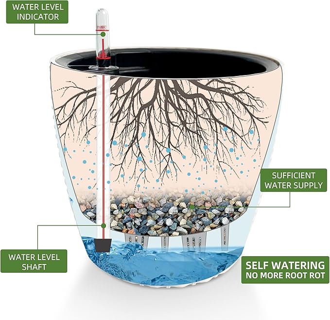 • Self Watering System: The integrated water reservoir keeps soil moist and automatic, with an indicator to show when to water again.