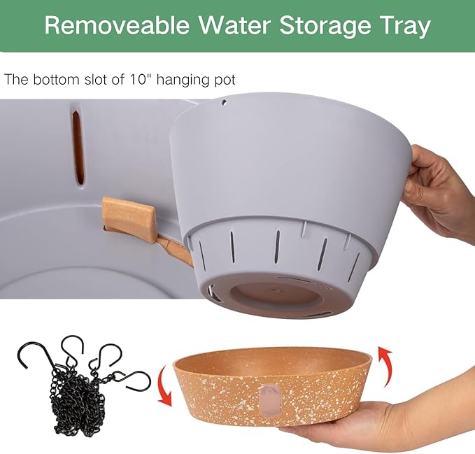 • SNAP-IN TRAY & WATER STORAGE: Snap-in tray is convenient to clean hanging plant pot. Hanging pots can overflow excess water from the edge, and the tray will store 7-14 days water for plants