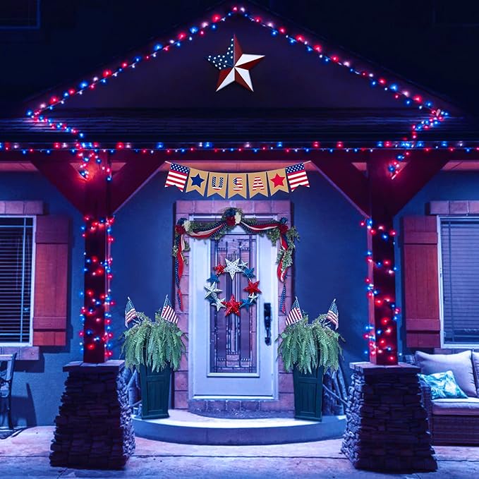 • WATERPROOF & SAFETY: We can't be sure if it will rain on 4th of July Eve and 4th of July, so you need waterproof outdoor solar string lights. All components of our lights, including light beads, light wires, and solar panels are IP44 waterproof, so please don't worry about weather. The panic is all someone else's! Besides, string lights are solar powered and avoid short circuits and fires