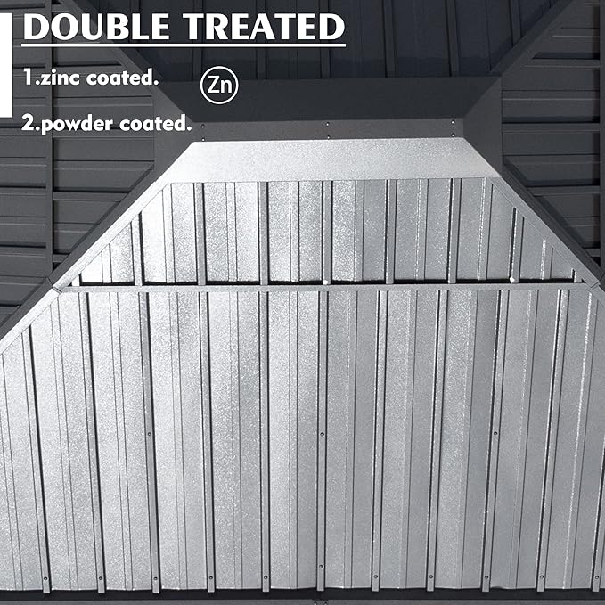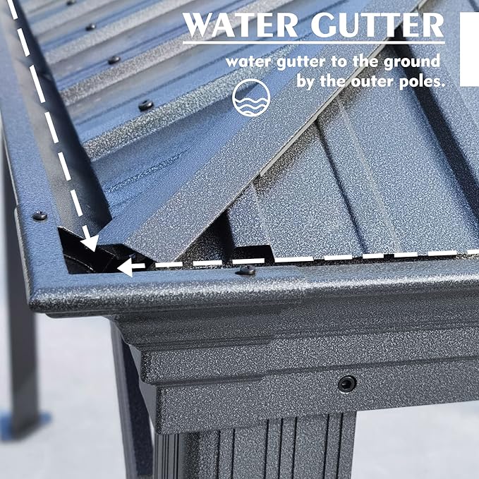 • ✅Metal Canopy/Roof and Gutter Design - The metal canopy of this gazebo ensures longevity and durability. Its roof, made of sheet metal, boasts a robust 29-gauge thickness, which is thicker than most gazebos on the market. its water gutter system ensures that rainwater is efficiently directed away from the edges of the frame and poles.