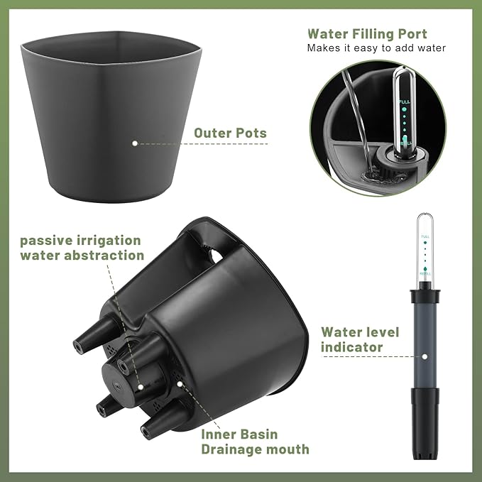 • GS Garden self watering planters are made of high-quality polypropylene, almost unbreakable. You don't have to worry about it breaking and leaking in your home. Our pot colors are long-lasting, vibrant colors that are more resistant the direct sunlight, available in a wide variety of colors (more colors will be available soon).