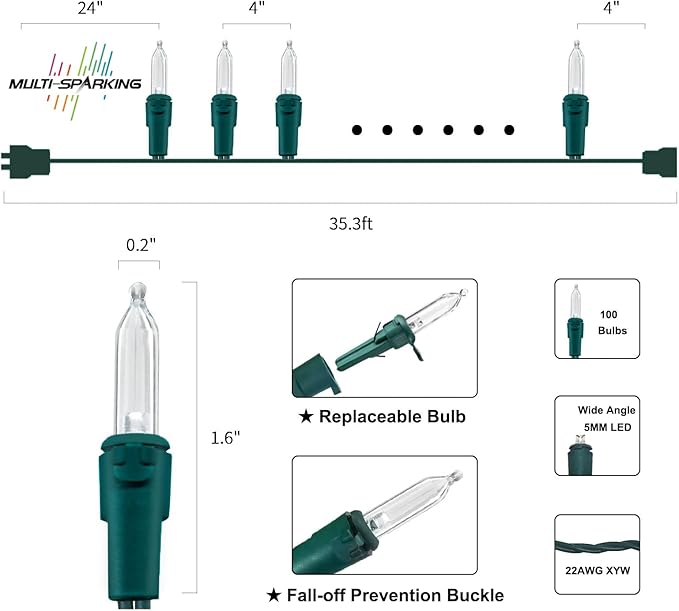 • 【Mini LED Christmas Lights Specification】: This green wire christmas string lights includes 100 count warm white led lights, total length 35.3ft, lights length 33ft and each led is 4 inches apart, 24 inches lead wire, 4 inches end connector (Extra 2 x replacement bulbs and 2 x fuse included)