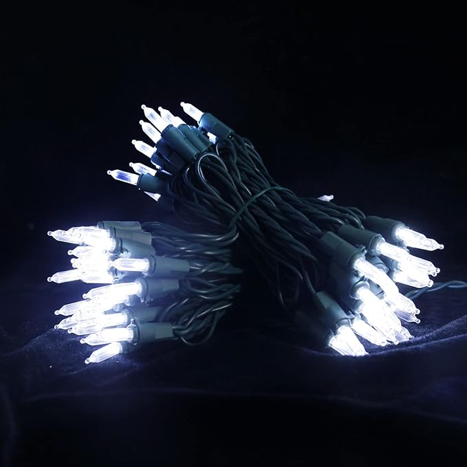 • 【Mini LED Christmas Lights Specification】: 2 Sets - green wire christmas string lights includes 100 count cool white led lights, total length 35.3ft, lights length 33ft and each led is 4 inches apart, 24 inches lead wire, 4 inches end connector (Extra 2 x replacement bulbs and 2 x fuse included)