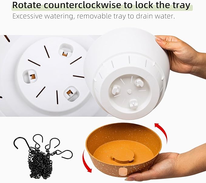 • SNAP-IN TRAY & WATER STORAGE: Snap-in tray is convenient to clean hanging plant pot. Hanging pots can overflow excess water from the edge, and the tray will store 7-14 days water for plants