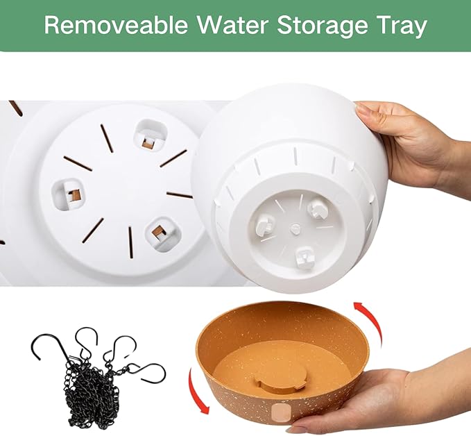 • SELF WATERING & VISIBLE WATER LEVEL: Self watering hanging pot is ingeniously designed, tightly connecting the tray and the pot body, turning the tray into a water reservoir with visible holes, allowing you to clearly see the water level (If you water too much, water will flow out from the edge of the tray to prevent the plants from being submerged)