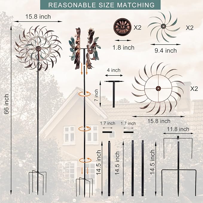 • Large Wind Spinners: Metal wind spinner adds a touch of vitality to your outdoor decor. It spins with the breeze, shining in the sunlight. Perfect for pathway, patio, lawn and garden decor